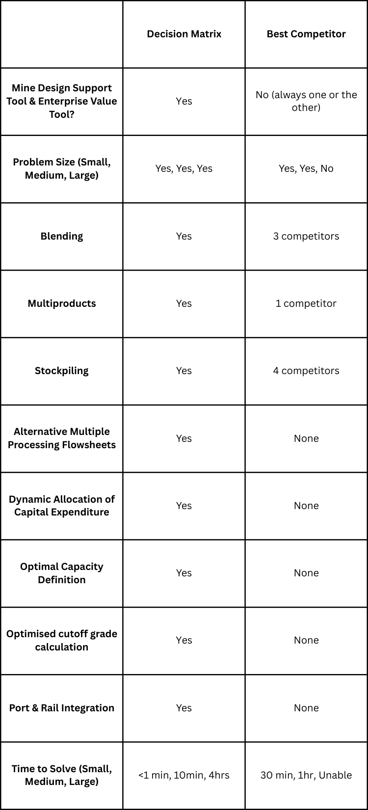 Time to Solve: Small = 1 Mine Deposit, Medium = 3 Mine Deposits, Large = 20+ Mine Deposits. Bear in mind, Decision Matrix does more in less time.