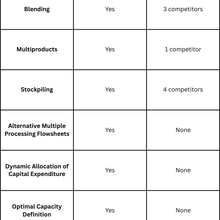 *Competitors with the most widespread use: COMET, Minemax, Whittle, Maroma, DBS Scheduler. If there's been any significant advancements on your part please contact us.